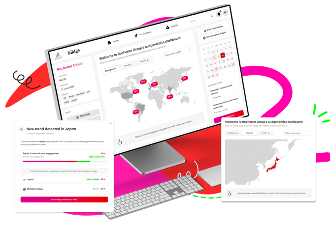 Data is presented in a clear, easy-to-digest format, giving you insight on your people’s engagement with nudge, overall financial health, needs, and interests, benefit campaign engagement, and wider business impacts (see examples below).